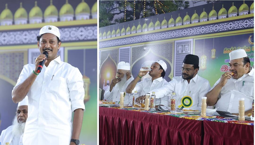 இஃப்தார் நோன்பு திறப்பு விழாவில் கலந்துகொண்ட அமைச்சர் அன்பில் மகேஸ் பொய்யாமொழி இறைவனிடம் கையேந்துங்கள் என்று உருக்கமாகப் பாட்டு பாடியது