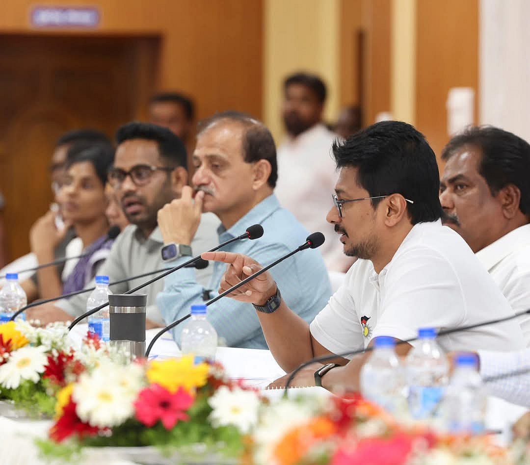 விருதுநகர் மாவட்ட ஆட்சியர் அலுவலக கூட்டரங்கில் நடைபெற்ற அனைத்துத் துறை அலுவலகர்களுடனான ஆய்வுக் கூட்டத்தில் துணை முதல்வர் உதயநிதி ஸ்டாலின்